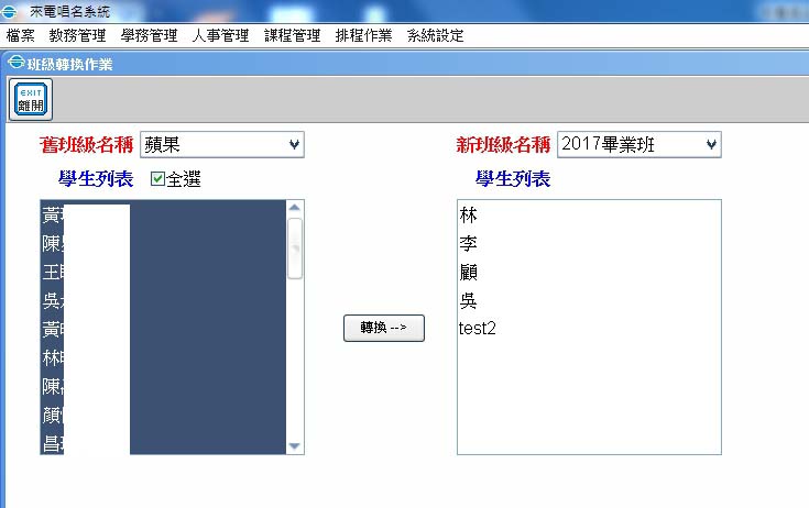 學務管理/舊班級名稱 班級轉換作業/將學生由左邊轉換至右邊
